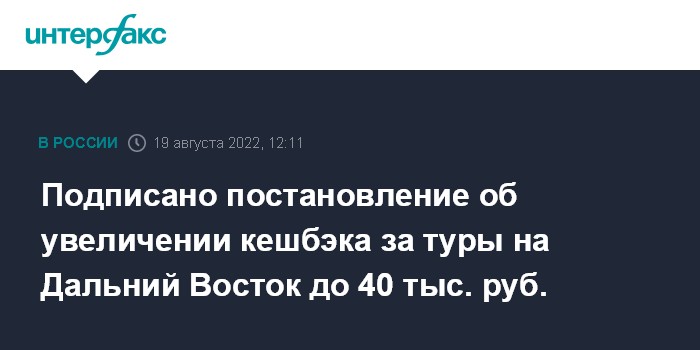 Подписано постановление об увеличении кешбэка за туры на Дальний Восток до 40 тыс. руб.