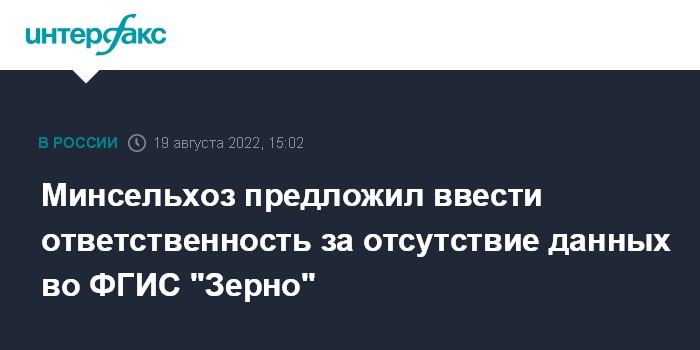 Москва. 19 августа. INTERFAX.RU - Минсельхоз предлагает ввести административную ответственность за внесение в информационную систему "Зерно" (ФГИС "Зерно", система прослеживаемости зерна) недостоверной информации, а также в случаях, когда требуемые данные не вносятся в нее.