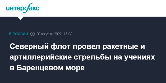 Москва. 20 августа. INTERFAX.RU - Корабли Северного флота России на учениях в Баренцевом море выполнили зенитные ракетные и артиллерийские стрельбы, сообщила пресс-служба флота в субботу.
