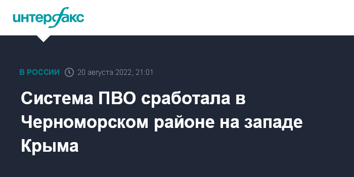 Москва. 20 августа. INTERFAX.RU - Система противовоздушной обороны сработала в Черноморском районе на крайнем западе Крыма в субботу вечером, сообщил советник главы республики Олег Крючков.