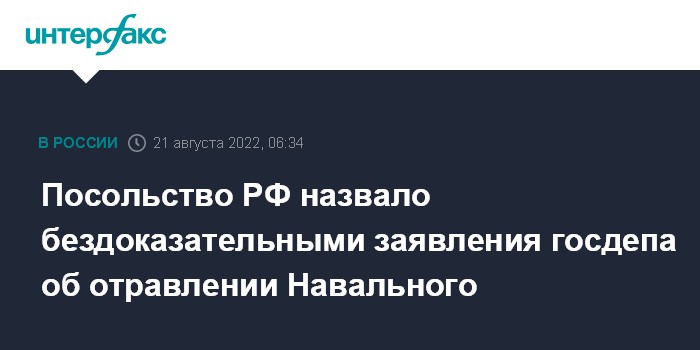 Москва. 21 августа. INTERFAX.RU - Посольство России в США отреагировало на очередные обвинения госдепартамента США в адрес России относительно якобы имевшего место отравления оппозиционера Алексея Навального и применения против него химического оружия.