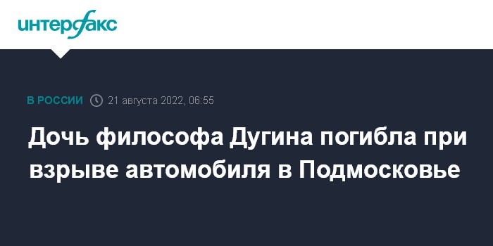 Москва. 21 августа. INTERFAX.RU - Автомобиль, в котором ехала дочь философа Александра Дугина Дарья, взорвался в ночь на воскресенье в Московской области, сообщает "Коммерсантъ" со ссылкой на очевидцев.