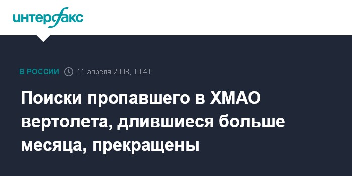 Ханты-Мансийск. 11 апреля. INTERFAX.RU - В Ханты-Мансийском автономном округе (ХМАО) прекращены воздушные и наземные поиски пропавшего в первых числах марта вертолета, на борту которого было два человека.