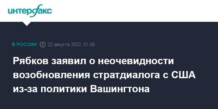 Москва. 22 августа. INTERFAX.RU - Замглавы МИД РФ Сергей Рябков заявил, что возможность продолжения прерванного США стратегического диалога с Россией неочевидна с учетом антироссийской политики Вашингтона.