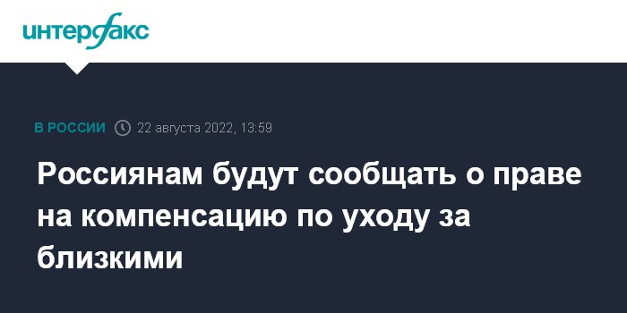Москва. 22 августа. INTERFAX.RU - Граждане с 2023 года начнут автоматически получать уведомления о том, что у них появилось право на компенсационные выплаты по уходу за близкими, сообщил на совещании с вице-премьерами премьер-министр Михаил Мишустин.