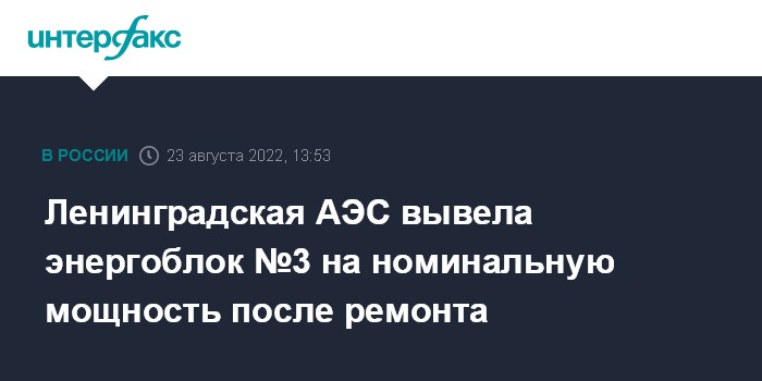 Москва. 23 августа. INTERFAX.RU - Третий энергоблок Ленинградской АЭС (ЛАЭС, филиал АО "Концерн Росэнергоатом") выведен на номинальную мощность после досрочного завершения планового ремонта. Об этом сообщает управление информации и общественных связей станции.