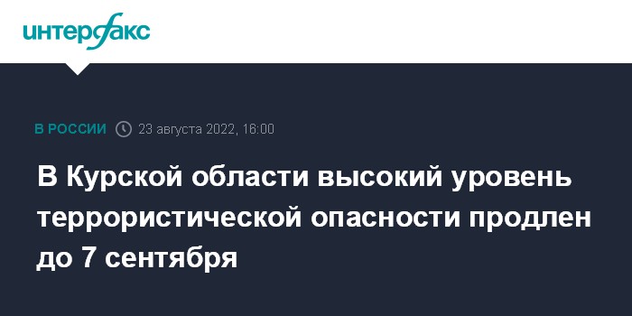 Москва. 23 августа. INTERFAX.RU - Губернатор Курской области Роман Старовойт сообщил о продлении действующего в регионе "желтого" (высокого) уровня террористической опасности еще на 15 дней, до 7 сентября.