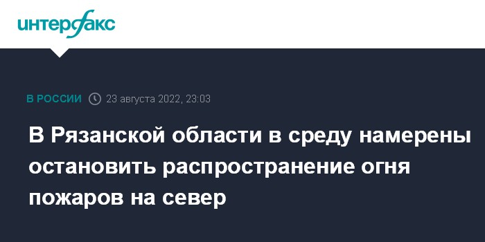 Москва. 23 августа. INTERFAX.RU - Распространение природных пожаров в Рязанской области в северном направлении предположительно будет остановлено в среду, сообщил во вторник в своем телеграмм-канале врио губернатора региона Павел Малков.