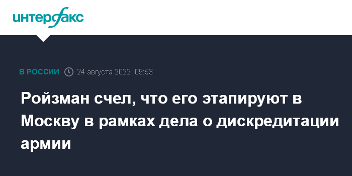 Москва. 24 августа. INTERFAX.RU - Бывший мэр Екатеринбурга Евгений Ройзман подтвердил информацию о том, что в отношении него возбуждено уголовное дело по статье УК РФ о публичных действиях, направленных на дискредитацию использования Вооруженных сил РФ.