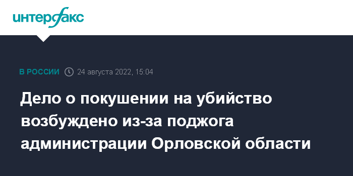 Ранее о попытке поджога административного здания в своем телеграм-канале сообщил губернатор Орловской области Андрей Клычков. Он предположил, что инцидент может быть связан с Днем независимости Украины, отмечаемым там 24 августа.