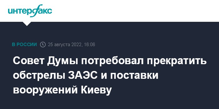 Москва. 25 августа. INTERFAX.RU - Совет Госдумы потребовал, чтобы Украина прекратила обстрелы Запорожской АЭС, а зарубежные страны - поставки вооружений на Украину.