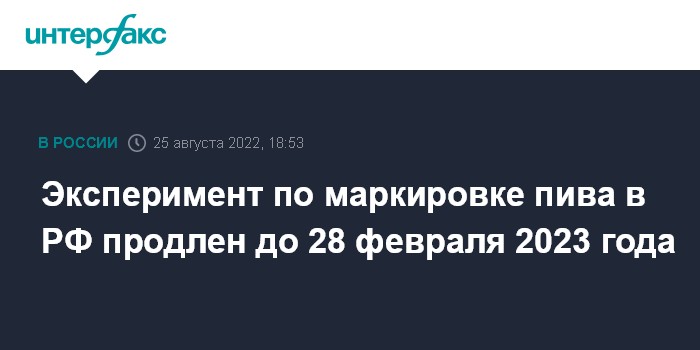Москва. 25 августа. INTERFAX.RU - Эксперимент по маркировке пива в России продлен до 28 февраля 2023 года. Это предусмотрено постановлением правительства РФ, опубликованным в четверг на официальном интернет-портале правовой информации.