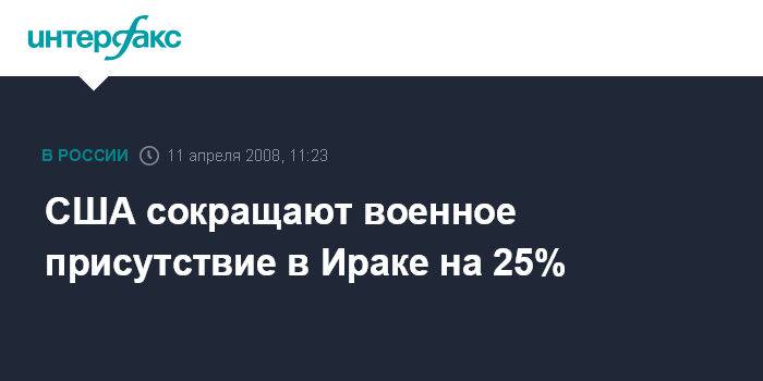 "Петреус (Дэвид Петреус - командующий войсками США в Ираке - ИФ) сообщил, что безопасность в стране улучшилась до того, чтобы к концу июля вывести несколько бригад из Ирака. Это значит, что к 31 июля количество боевых бригад в Ираке сократится на 25% по сравнению с прошлым годом", - сказал Дж.Буш в четверг в ходе обращения к нации.