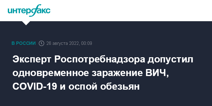 Москва. 26 августа. INTERFAX.RU - Случай одновременного заражения коронавирусом, вирусом оспы обезьян и ВИЧ-инфекцией является редким, но не уникальным событием, мала вероятность того, что вирусы в организме заболевшего повлияют друг на друга, сообщил руководитель Екатеринбургского научно-исследовательского института вирусных инфекций научного центра "Вектор" Роспотребнадзора Александр Семенов.