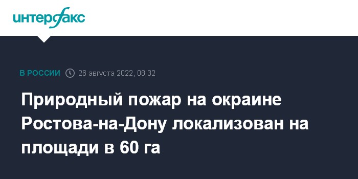 Москва. 26 августа. INTERFAX.RU - Пожарные локализовали ландшафтный пожар на окраине Ростова-на-Дону, где в четверг днем загорелся камыш, сообщает пресс-служба ГУ МЧС России по Ростовской области.