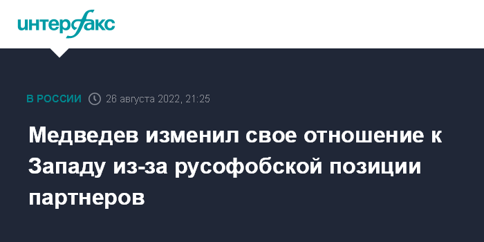 Москва. 26 августа. INTERFAX.RU - Зампред Совета безопасности РФ Дмитрий Медведев признал, что теперь занимает гораздо менее либеральную позицию в отношении Запада, и пояснил, что виноваты в этом сами западные партнеры, занявшие русофобские позиции.