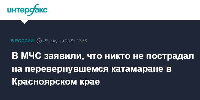 Москва. 27 августа. INTERFAX.RU - Катамаран, на котором находились семь человек, перевернулся в Красноярском крае, пострадавших нет, сообщили "Интерфаксу" в пресс-службе главного управления МЧС по региону в субботу.