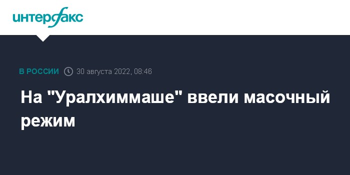 Москва. 30 августа. INTERFAX.RU - На ПАО "Уралхиммаш" с 29 августа ввели масочный режим, сообщили "Интерфаксу" в пресс-службе завода. Там это решение назвали вынужденной мерой по сохранению здоровья сотрудников.