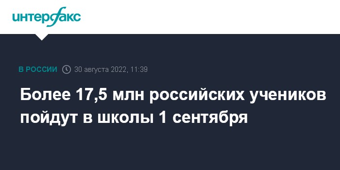 Москва. 30 августа. INTERFAX.RU - Все российские регионы завершают плановую подготовку к началу учебного года, 1 сентября в школы пойдут более 17,5 млн учеников, сообщила во вторник вице-премьер РФ Татьяна Голикова.