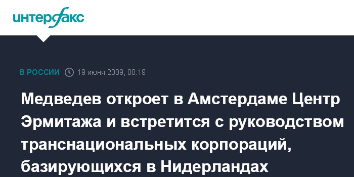 Медведев откроет в Амстердаме Центр Эрмитажа и встретится с руководством транснациональных корпораций, базирующихся в Нидерландах