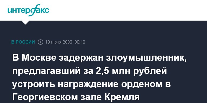 В Москве задержан злоумышленник, предлагавший за 2,5 млн рублей устроить награждение орденом в Георгиевском зале Кремля