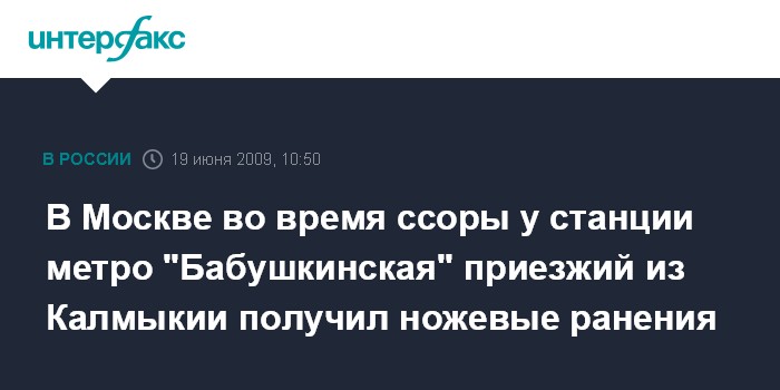Москва. 19 июня. INTERFAX.RU – В Москве во время ссоры у метро "Бабушкинская" ножевые ранения получил приезжий из Калмыкии, нападавшего задержать по горячим следам не удалось, сообщил "Интерфаксу" источник в правоохранительных органах города в пятницу.