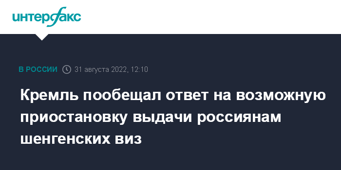 Москва. 31 августа. INTERFAX.RU - В Кремле внимательно отслеживают ситуацию с возможной приостановкой выдачи шенгенских виз россиянам, за очередной порцией недружественных действий последует ответная реакция, заявил пресс-секретарь президента РФ Дмитрий Песков.