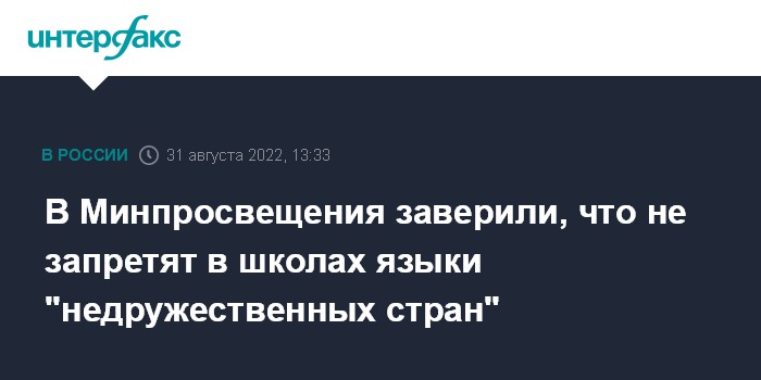 Москва. 31 августа. INTERFAX.RU - В российских школах не планируют отменить изучение языков "недружественных стран", сказала замминистра просвещения Татьяна Васильева, отвечая на вопросы участников IX Общероссийского родительского собрания.