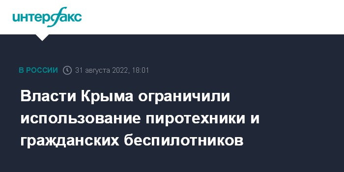 Москва. 31 августа. INTERFAX.RU - Использование гражданских беспилотных летательных аппаратов и запуск салютов на время проведения специальной военной операции на Украине решили ограничить в Крыму, сообщил глава региона Сергей Аксенов.