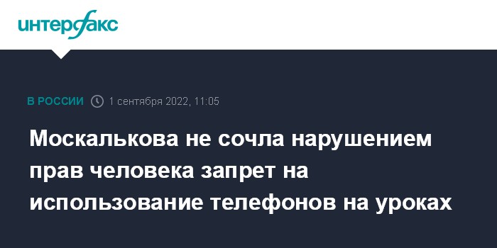 Москва. 1 сентября. INTERFAX.RU - Запрет на использование школьниками мобильных телефонов во время урока не связан с нарушением прав человека, он был введен для лучшей концентрации учеников на предмете, заявила в четверг уполномоченная по правам человека в РФ Татьяна Москалькова.
