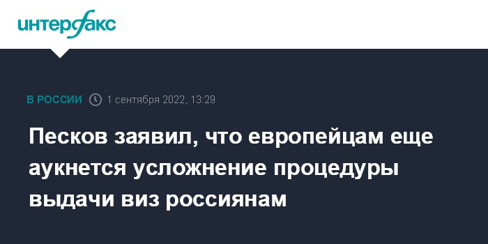 Говоря о последствиях процедуры изменения визового режима, между РФ и ЕС, Песков отметил: "Это плохо для россиян, потому что визы будут получать дольше и сложнее. Мы не знаем, как это все будет, но скорее всего, процесс будет сложнее".