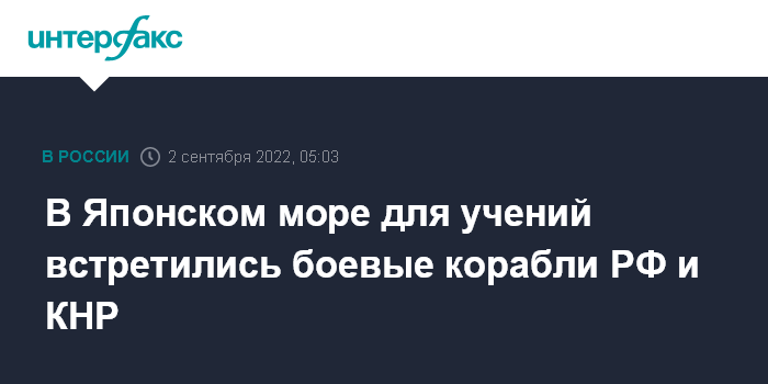 Москва. 2 сентября. INTERFAX.RU - Отряды боевых кораблей ВМФ России и ВМС Китая, участвующие в учениях "Восток-2022", поприветствовали друг друга в Японском море и приступили к отработке практических задач, сообщает в пятницу российское министерство обороны.