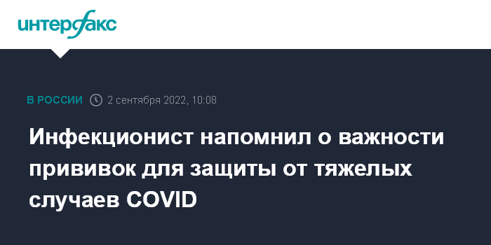 Москва. 2 сентября. INTERFAX.RU - Вакцина от COVID-19 продолжает защищать от тяжелого течения заболевания при ревакцинации с промежутком в полгода, заявил главный внештатный специалист Минздрава по инфекционным болезням, профессор Владимир Чуланов и призвал сограждан ревакцинироваться.