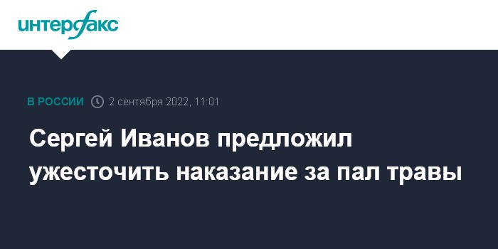 Москва. 2 сентября. INTERFAX.RU - Спецпредставитель президента по вопросам природоохранной деятельности, экологии и транспорта Сергей Иванов на форуме "Экосистема. Заповедный край" высказался за ужесточение наказания за палы травы.