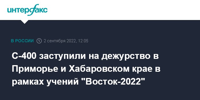 Москва. 2 сентября. INTERFAX.RU - Расчеты зенитных ракетных систем С-400 "Триумф" Восточного военного округа (ВВО) заступили на боевое дежурство в Хабаровском и Приморском краях в рамках стратегических командно-штабных учений (СКШУ) "Восток-2022", сообщило министерство обороны РФ в пятницу.