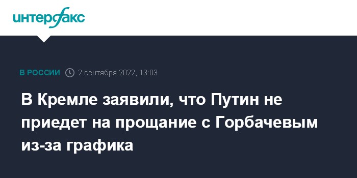 Москва. 2 сентября. INTERFAX.RU - Президент России Владимир Путин не сможет принять участие в церемонии прощания с бывшим президентом СССР Михаилом Горбачевым, поскольку на субботу у него запланировано много совещаний, он будет готовиться к Дальневосточному экономическому форуму, сообщил пресс-секретарь главы государства Дмитрий Песков.