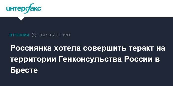 Москва. 19 июня. INTERFAX.RU - Сотрудники брестской милиции задержали в Бресте гражданку России, которая угрожала совершить террористический акт на территории генерального консульства России в Бресте, сообщили агентству "Интерфакс- Запад" в пятницу в министерстве внутренних дел Белоруссии. В МВД сообщили, что в Бресте по телефону "102" позвонила неизвестная и сообщила, что на территории генерального консульства РФ будет совершен террористический акт. По подозрению в совершении преступления задержана женщина 1958 года рождения.