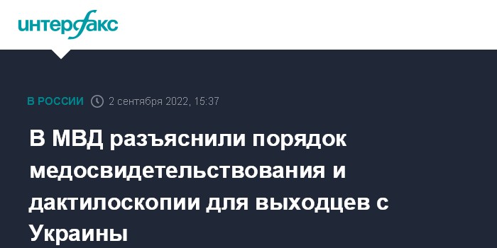 Москва. 2 сентября. INTERFAX.RU - Прибывшим в Россию жителям Украины, Луганской и Донецкой народных республик необходимо пройти процедуры дактилоскопирования, фотографирования и медосвидетельствования, чтобы получить право временного бессрочного пребывания в России и трудоустройства без патента, сообщили в пресс-центре МВД России.