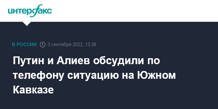 Москва. 3 сентября. INTERFAX.RU - Президент России Владимир Путин в телефонном разговоре с президентом Азербайджана Ильхамом Алиевым обсудил текущую ситуацию на Южном Кавказе, сообщила в субботу пресс-служба Кремля.