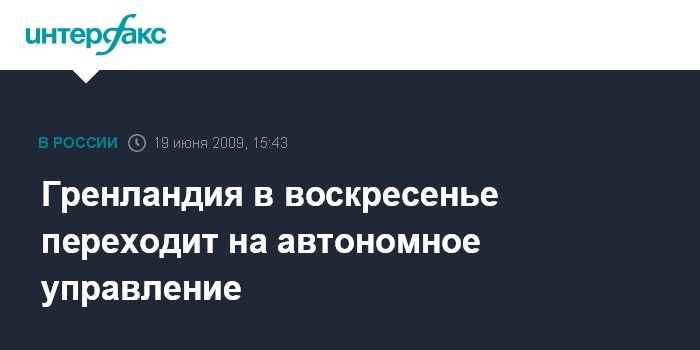 Москва. 19 июня. INTERFAX.RU - Арктический остров Гренландия в воскресенье переходит к режиму автономии после 300 лет датского правления, сообщают в пятницу местные СМИ. За создание автономного от Дании управления островом на референдуме в ноябре 2008 г. проголосовали 75% гренландцев.