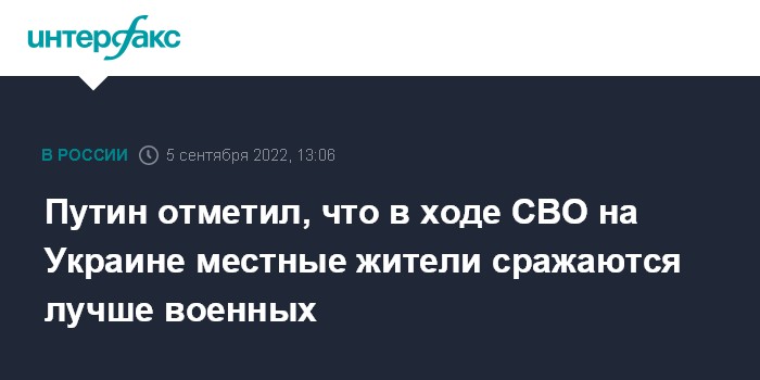 Москва. 5 сентября. INTERFAX.RU - Президент РФ Владимир Путин сообщил, что перед вылетом на Камчатку получил очередной доклад от Минобороны о ситуации в зоне специальной военной операции и отметил, что местные жители сражаются лучше профессиональных военных.