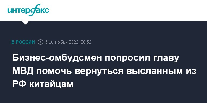 "К Титову поступило обращение председателя Союза китайских предпринимателей в России Чжоу Лицюня, согласно которому в 2021-2022 годах из страны было выслано несколько сотен граждан Китая, получивших наказание по статье 18.8 КоАП РФ за уклонение от выезда из РФ по истечении определенного срока. Это произошло, несмотря на два Указа президента, смягчающих миграционные условия на время закрытия границ между странами в период пандемии коронавируса", - сказали "Интерфаксу" в пресс-службе бизнес-омбудсмена.