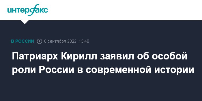 Москва. 6 сентября. INTERFAX.RU - Патриарх Московский и всея Руси Кирилл отвел России особую роль в современной истории, поскольку, по его словам, она не дает окончательно размыть границу между добром и злом.