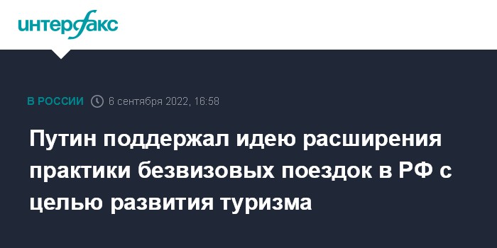 Москва. 6 сентября. INTERFAX.RU - Президент РФ Владимир Путин поддержал идею расширения практики безвизовых поездок для граждан конкретных стран, в том числе приезжающих в рамках групповых туров.