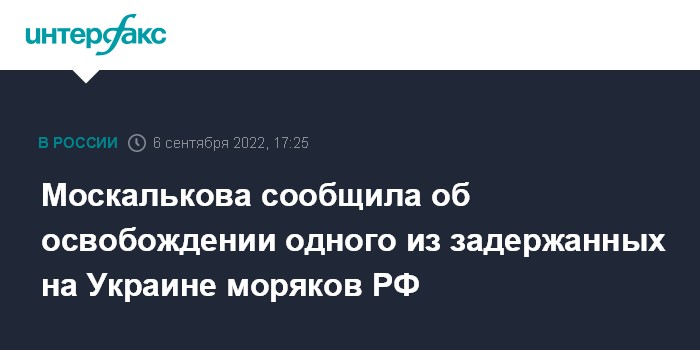Москва. 6 сентября. INTERFAX.RU - Один из 66 российских гражданских моряков, задержанных украинскими властями в порту Измаила, возвращен в Россию благодаря "компетентным органам", сообщила во вторник уполномоченная по правам человека в РФ Татьяна Москалькова.