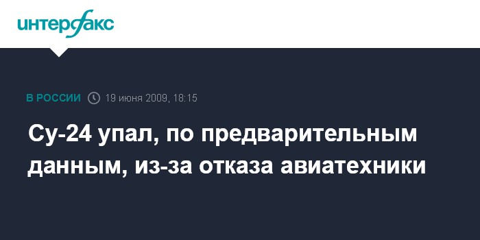 Москва. 19 июня.INTERFAX.RU - Предварительная причина падения фронтового бомбардировщика Су-24 в Ростовской области - отказ авиационной техники, сообщил "Интерфаксу" помощник главкома ВВС РФ, подполковник Владимир Дрик.
