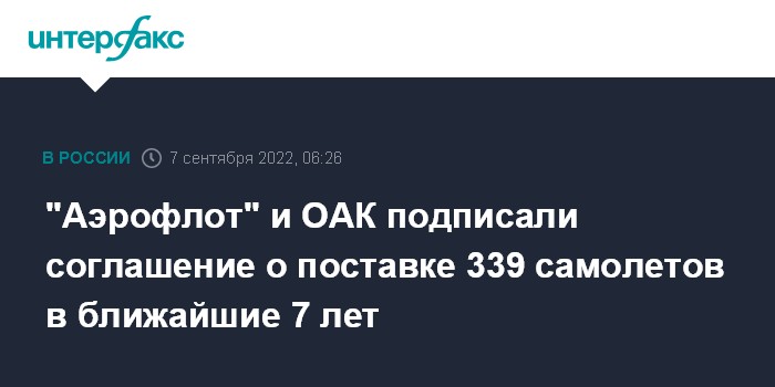 Москва. 7 сентября. INTERFAX.RU - "Аэрофлот" и "Объединенная авиастроительная корпорация" (ОАК) подписали соглашение о поставке 339 самолетов, передал корреспондент "Интерфакса" с церемонии подписания, которая состоялась в ходе Восточного экономического форума (ВЭФ-2022) в среду.