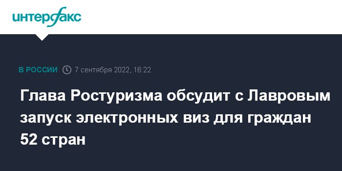 Москва. 7 сентября. INTERFAX.RU - Глава Ростуризма Зарина Догузова на следующей неделе планирует обсудить с министром иностранных дел Сергеем Лавровым запуск электронных виз для граждан 52 стран, в том числе недружественных к России, сказала она в среду.