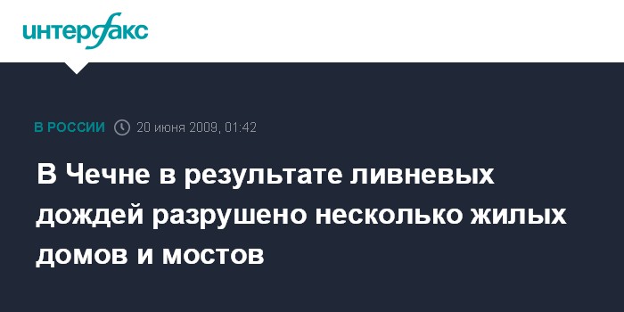 Грозный. 20 июня. ИНТЕРФАКС-ЮГ - Несколько мостов, жилых домов и часть коммуникаций разрушены в результате обрушившихся на несколько районов Чечни ливневых дождей и паводков на горных реках, сообщил "Интерфаксу" президент республики Рамзан Кадыров