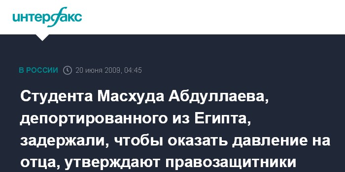 Москва. 20 июня. ИНТЕРФАКС - Правозащитники обеспокоены судьбой студента, депортированного накануне из Египта в Россию - Масхуда Абдуллаева, который является сыном одного из лидеров чеченских боевиков Супьяна Абдуллаева.